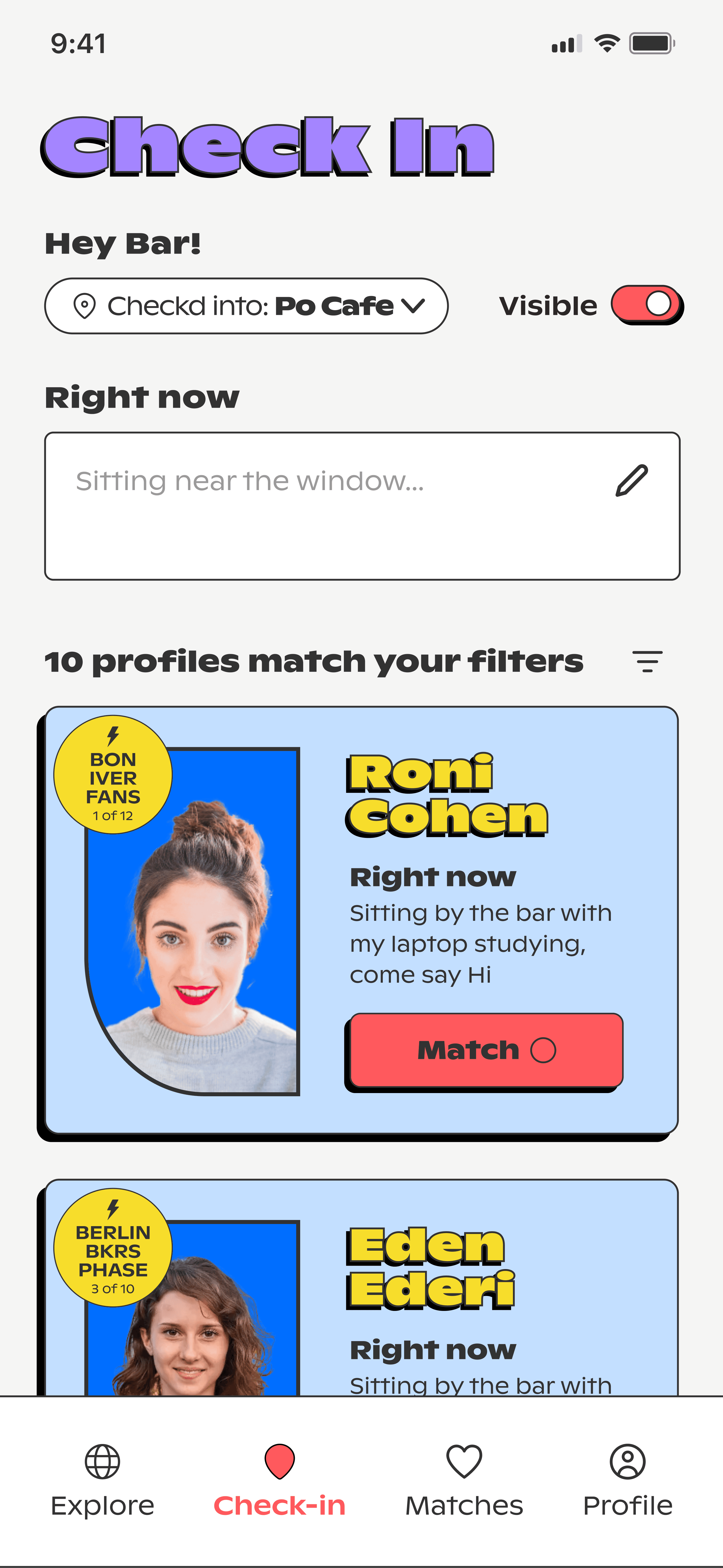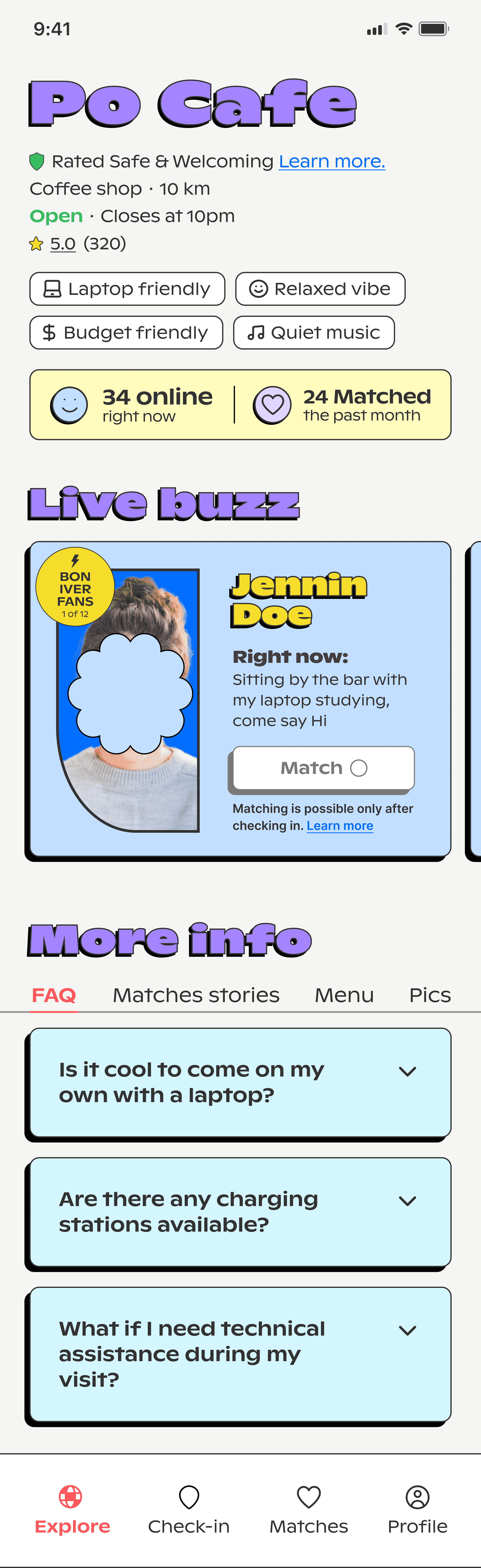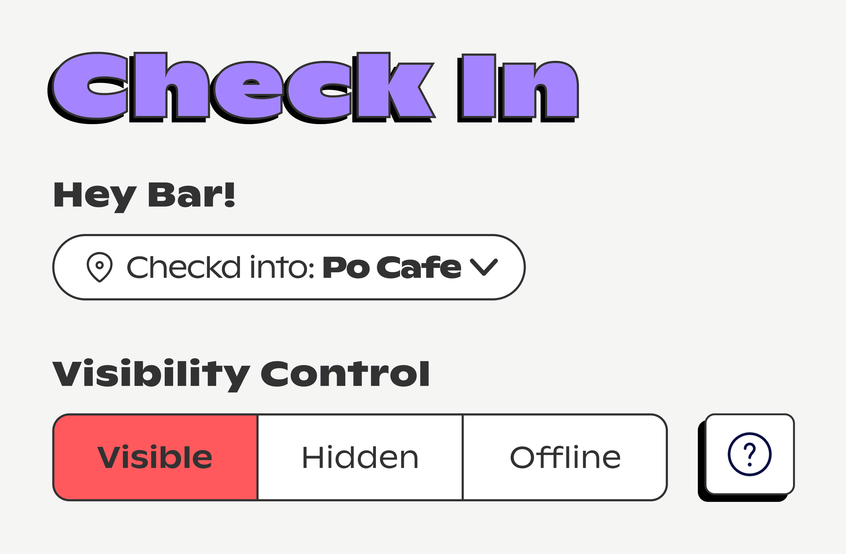Check-In is the shift from browsing to being part of the space. By checking in, users place themselves within the venue’s social layer—visible only to others who have done the same. This moment creates immediacy and reciprocity: you signal you’re here now, ready to engage, while staying anchored in the shared physical context.