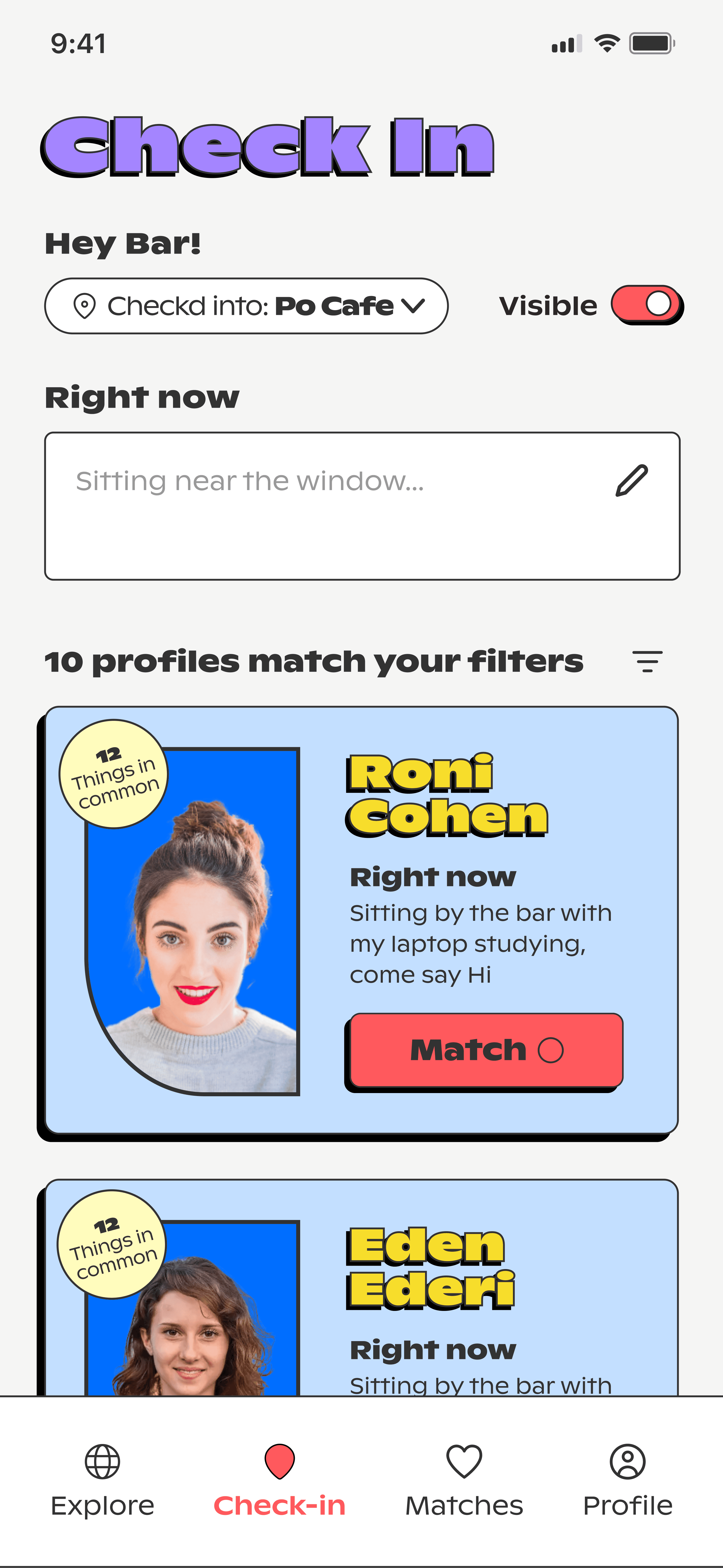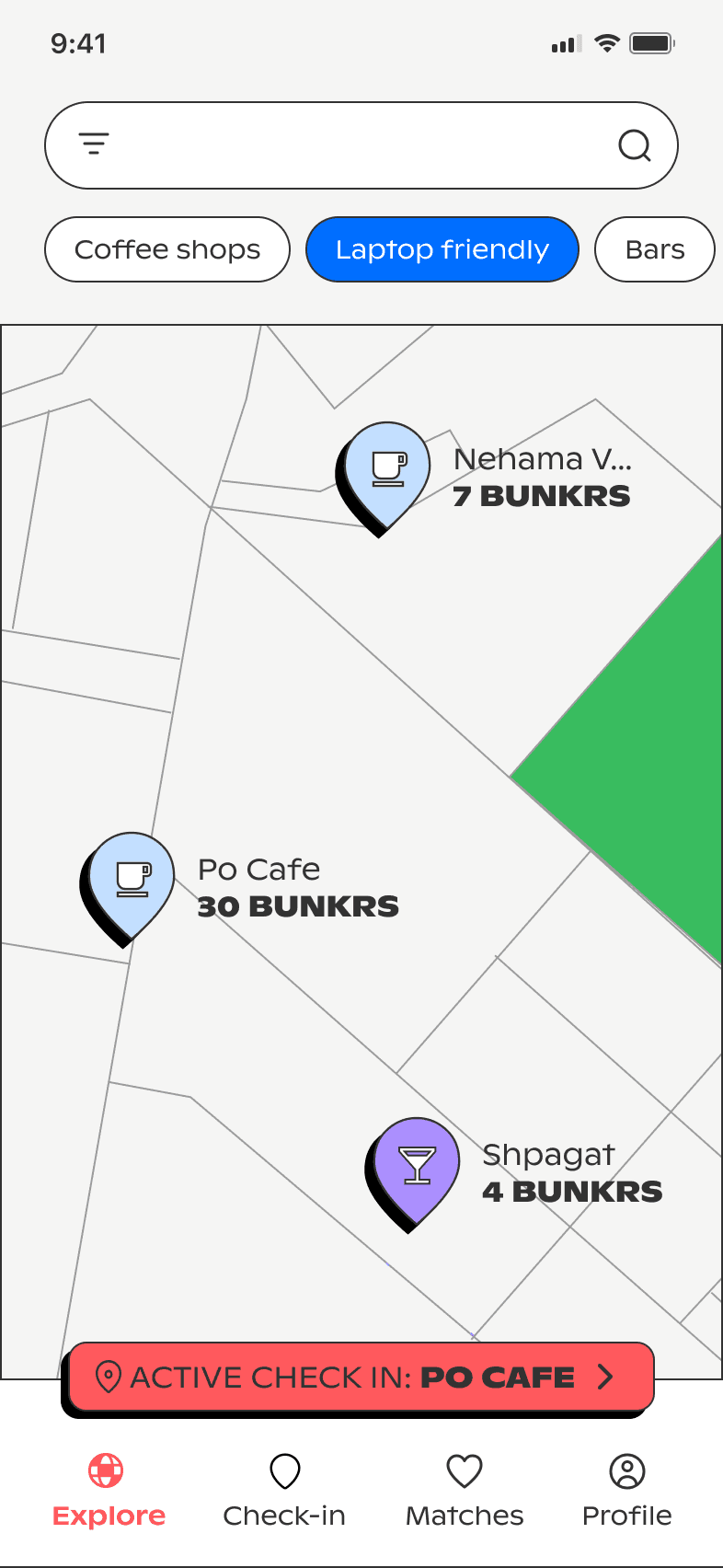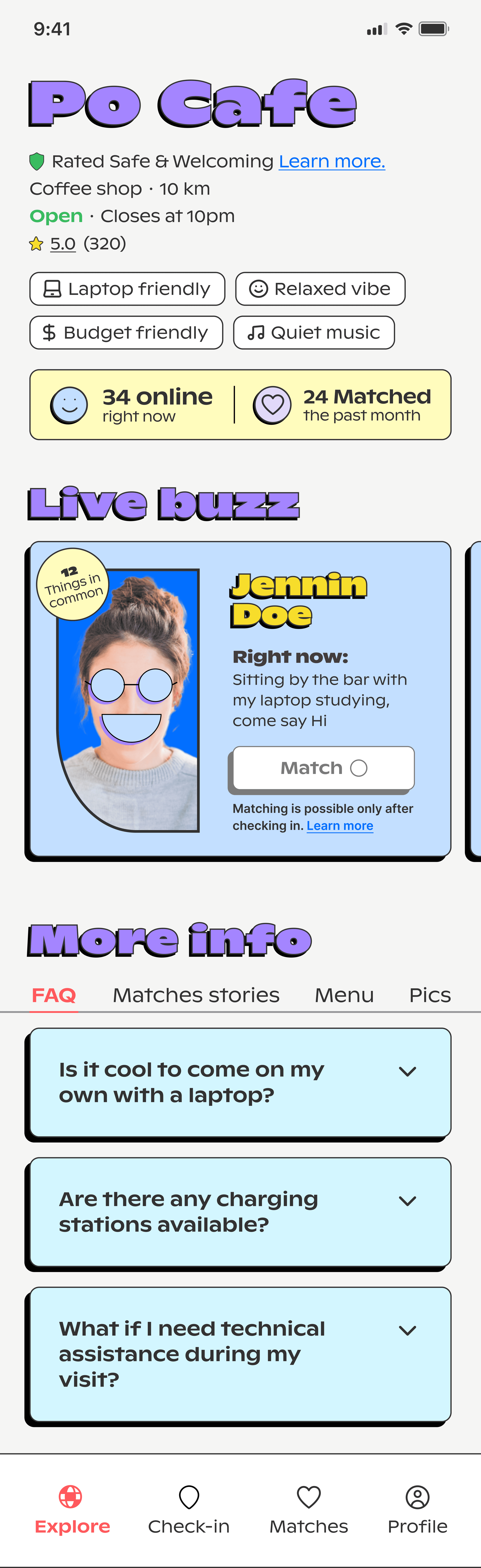Check-In is the shift from browsing to being part of the space. By checking in, users place themselves within the venue’s social layer—visible only to others who have done the same. This moment creates immediacy and reciprocity: you signal you’re here now, ready to engage, while staying anchored in the shared physical context.