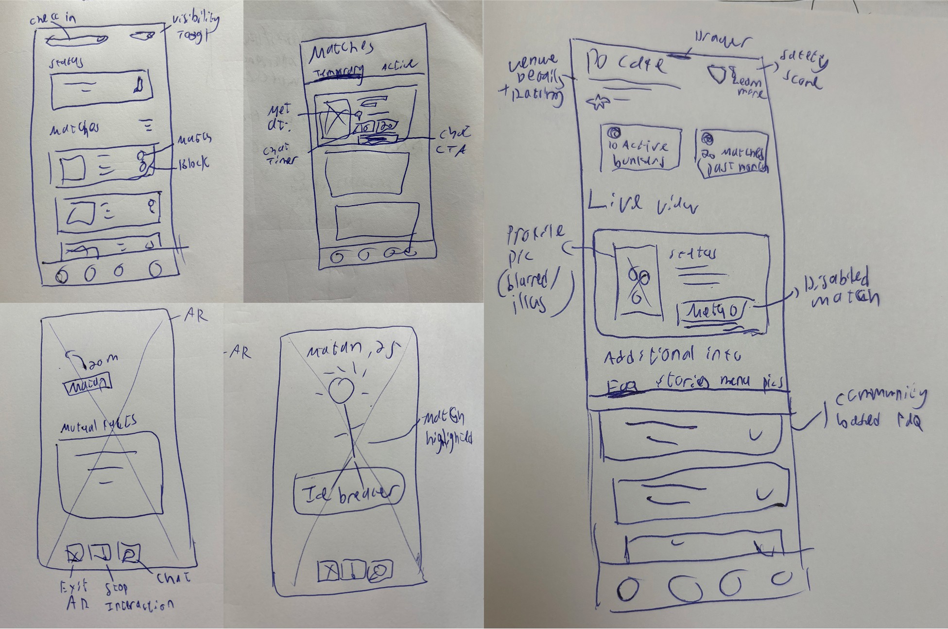 The Venue Drawer previews each place, its vibe, activity, and history—before users decide to navigate or check in. Profiles appear with graphic overlays that protect anonymity while still signaling presence, and stories or past match stats provide social proof. This balance of intrigue and reassurance turns venues into trusted contexts for connection.